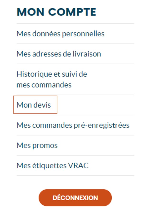 Dans votre compte : « Mon Compte », retrouvez votre devis dans l’encadré « Mon devis », également disponible dans le menu de gauche. Votre devis en cours y est renseigné.