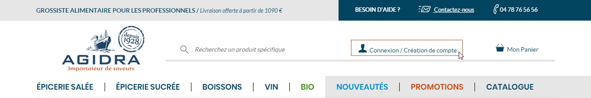 Afin de modifier vos coordonnées, vous devez tout d’abord être connecté sur votre compte client. Si ce n’est pas le cas, rendez-vous sur la page d’accueil du site Agidra et cliquez sur le lien « Connexion / Création de compte ».