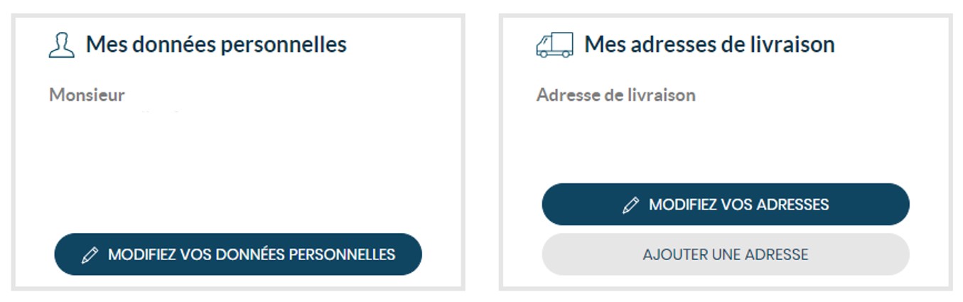 Une fois dans votre espace client, cliquez sur « MODIFIEZ VOS DONNÉES PERSONNELLES », pour modifier votre informations de facturation, ou « MODIFIER VOS ADRESSES », pour modifier vos informations de livraison, puis renseignez vos nouvelles coordonnées et enregistrez ces modifications en cliquant sur « VALIDEZ » en bas de la page.
