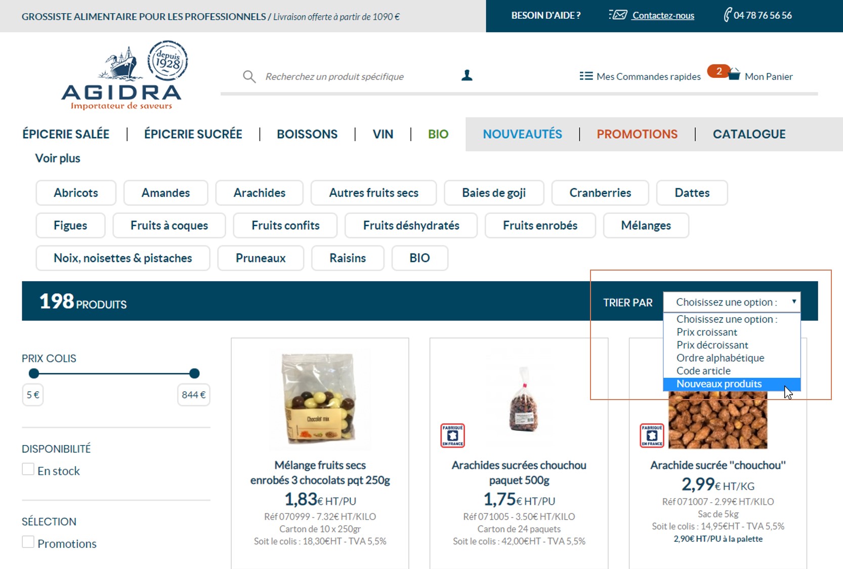 De plus, si vous avez déjà choisi un type de produit, par exemple les Fruits Secs, vous pouvez retrouver tous les nouveaux produits via la barre de tri intulée « TRIER PAR : » sur la droite de votre écran et en sélectionnant : « Nouveaux produits » dans le menu déroulant :