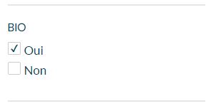 Enfin, si vous avez déjà choisi une catégorie de produit, par exemple les Fruits Secs, vous pouvez retrouver tous les produits BIO de cette famille de produit via le bouton « BIO » en haut de page ou le filtre « BIO » dans le menu de gauche. Il vous suffira de cliquer sur « Oui » pour les afficher.
