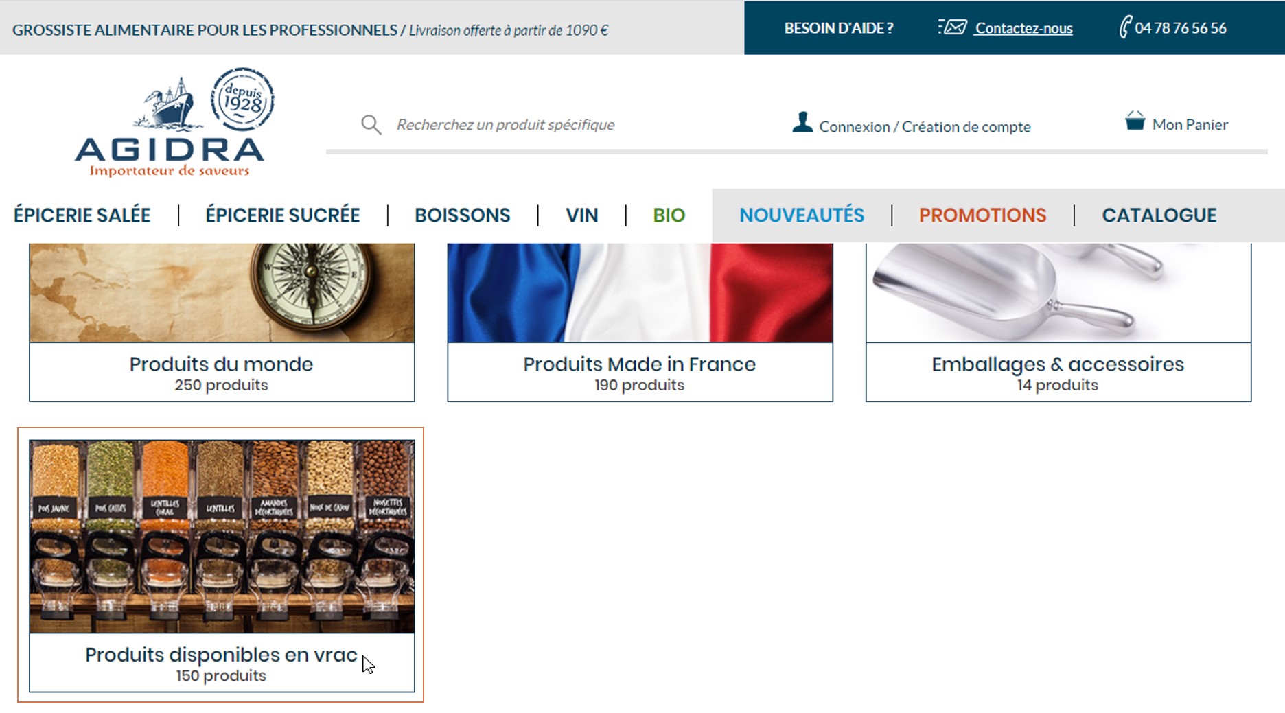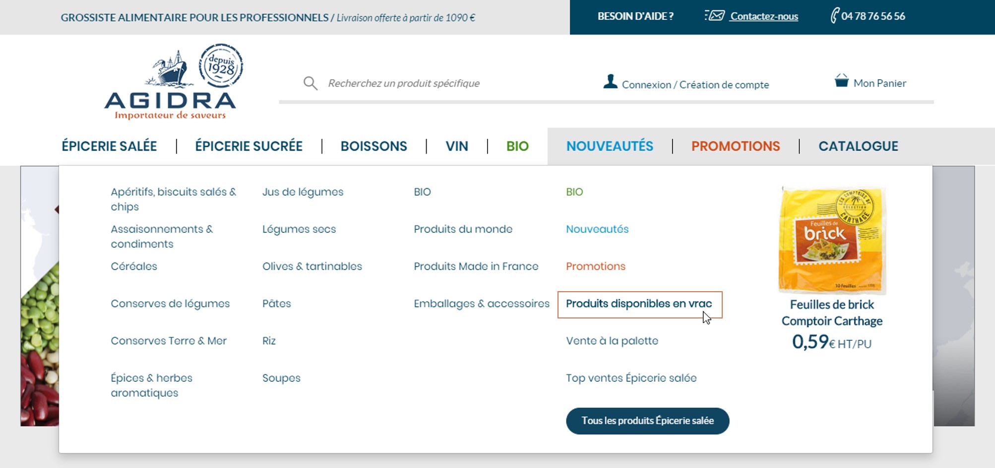 Pour retrouver tous les produits disponibles à la vente en vrac sur notre site, cliquez sur « Produits disponibles en vrac », dans le menu principal en haut de chaque page de notre site en survolant les familles de produit.