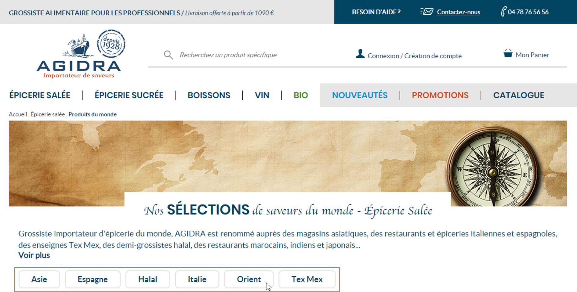 Une fois arrivé sur ces pages, ex : « Produits du monde - épicerie salée », sélectionnez la région ou la thématique qui vous intéresse :